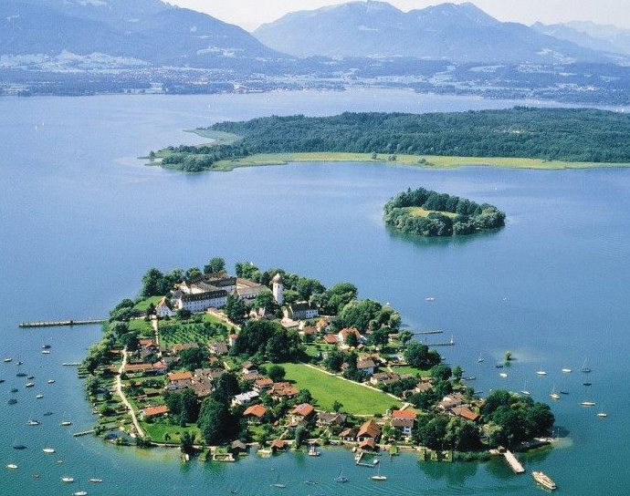 На острове расположена церковь святого Варфоломея, которая появилась здесь в XII веке, но свои красные купола в форме луковиц, приобрела в XV веке. Неподалеку от церкви находится бывший охотничий замок баварских королей (XVIII в.), ледяная часовня, свод которой не тает даже в летний период, небольшая гостиница и несколько рыбных ресторанов, в которых подают свежую форель выловленную рядом, практически у вас на глазах. Здесь же можно увидеть гуляющих оленей, которых подкармливают монахи.