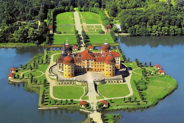 Поместье изначально строилось для проведения придворной охоты, но кардинальной перестройке подверглось в ХVIII веке, при любившем барочный стиль Августе Сильном. Были пристроены барочная часовня, капелла, миниатюрный маяк, гостевые апартаменты, Фазаний домик, конюшни. Соединили многочисленные озера вокруг замка, превратив их в один большой водоем. В ландшафт парка добавились прекрасные садово-архитектурные композиции дошедшие до наших дней.